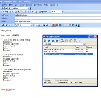 Otra de las funciones interesantes es la de enviar informes del estado de las tareas por correo electrónico. Dando a un botón, se abrirá el programa de correo predeterminado con un mensaje listo para enviarlo.